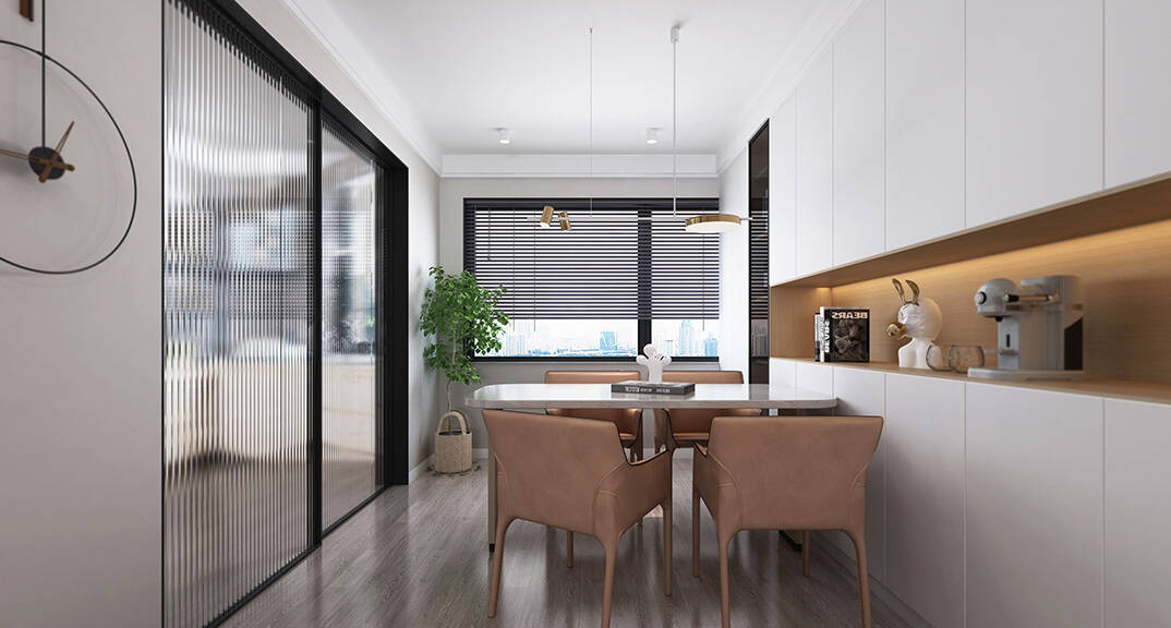 分色墻和弧形門洞設(shè)計(jì)自帶線條感拉伸空間層次。簡潔利落的硬裝設(shè)計(jì)使空間更具現(xiàn)代感。