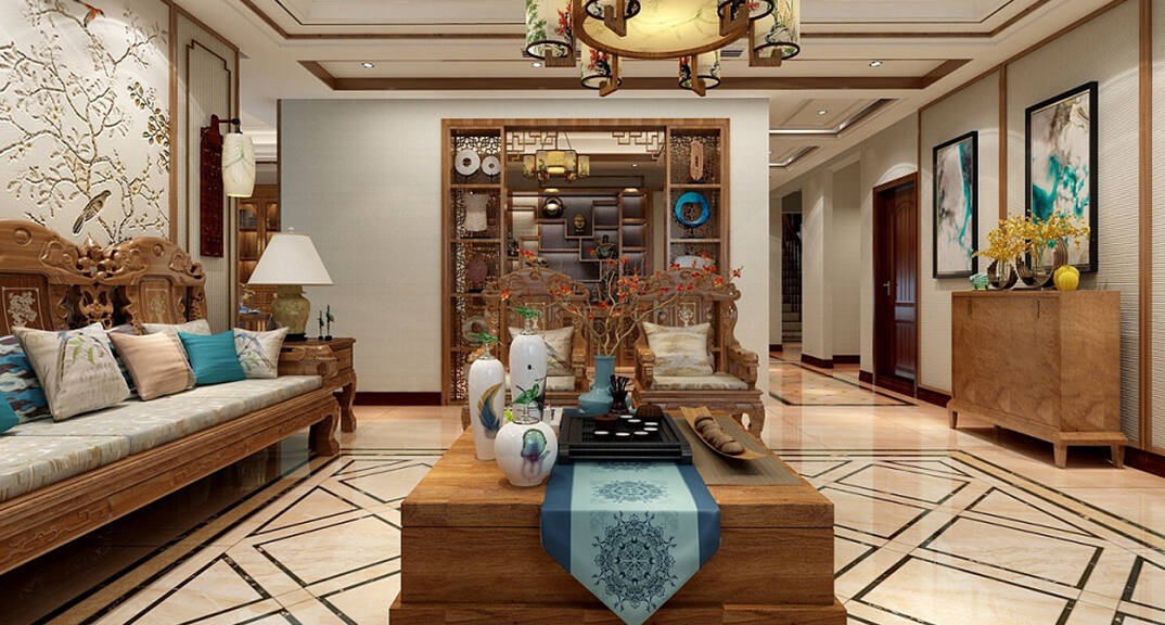 海川泓久山墅635㎡別墅客廳新中式風(fēng)格裝修案例效果圖