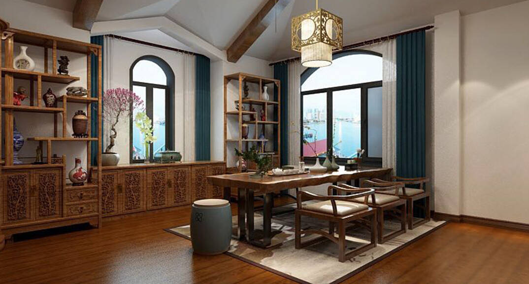 海川泓久山墅635㎡別墅茶室新中式風(fēng)格裝修案例效果圖