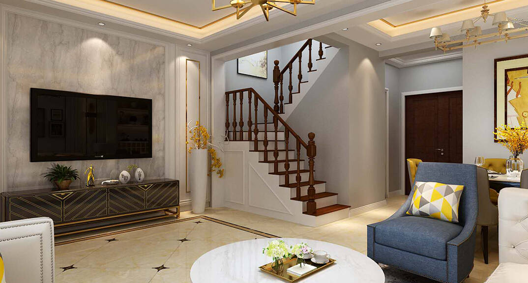 本案為美式風格別墅裝修,以“太陽”為主題元素,采用白色為背景色,藍色、棕紅色為主色,黃色為點綴色,使整個空間如在陽光下照耀著。