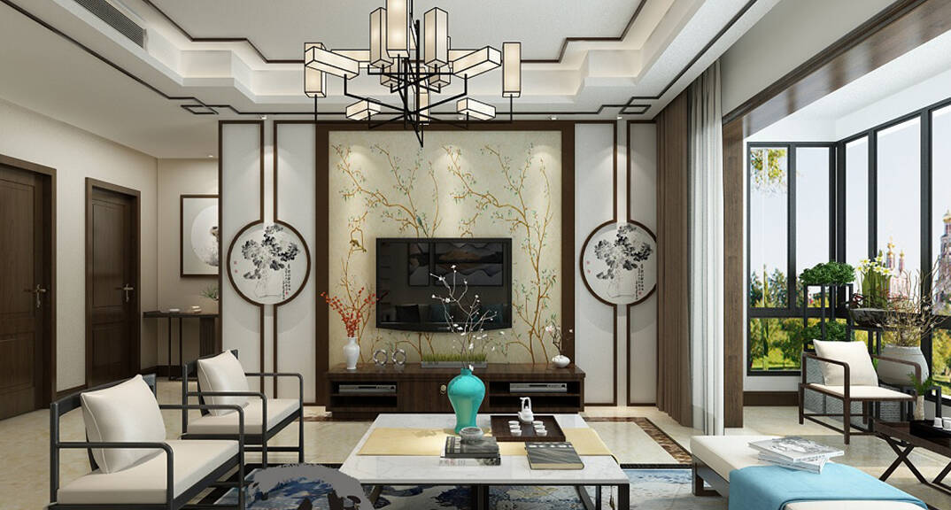 縵沙半島115㎡四室兩廳兩衛(wèi)客廳現(xiàn)代中式風(fēng)格裝修案例效果圖