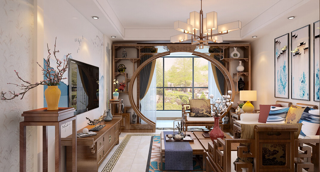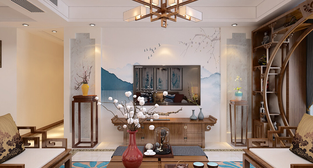 新興中心城125㎡三室兩廳客廳電視新中式風(fēng)格裝修案例效果圖
