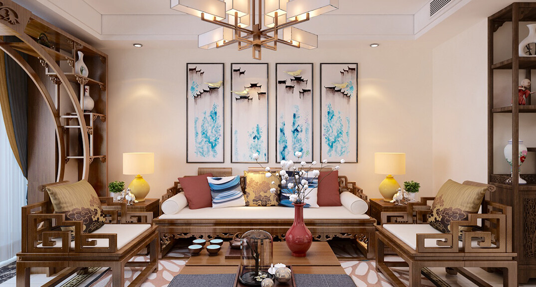 新興中心城125㎡三室兩廳客廳沙發(fā)新中式風(fēng)格裝修案例效果圖