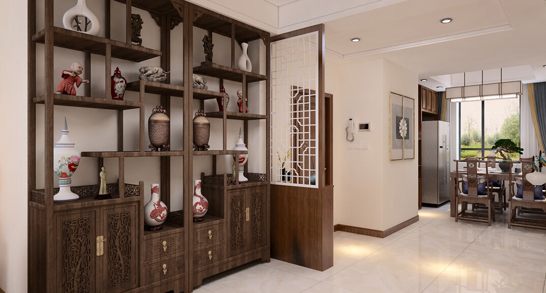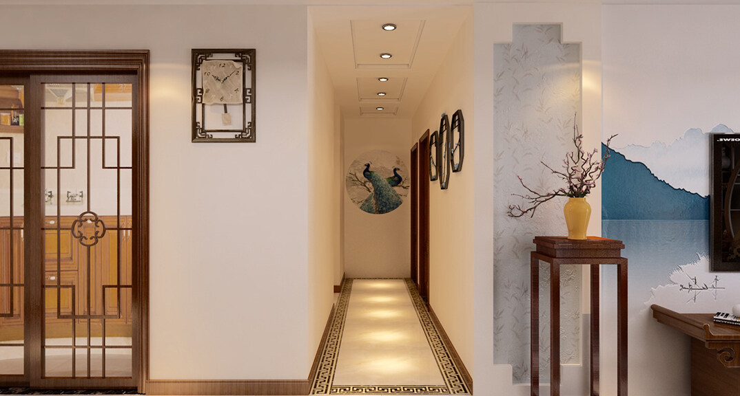 新興中心城125㎡三室兩廳門(mén)廳走廊新中式風(fēng)格裝修案例效果圖
