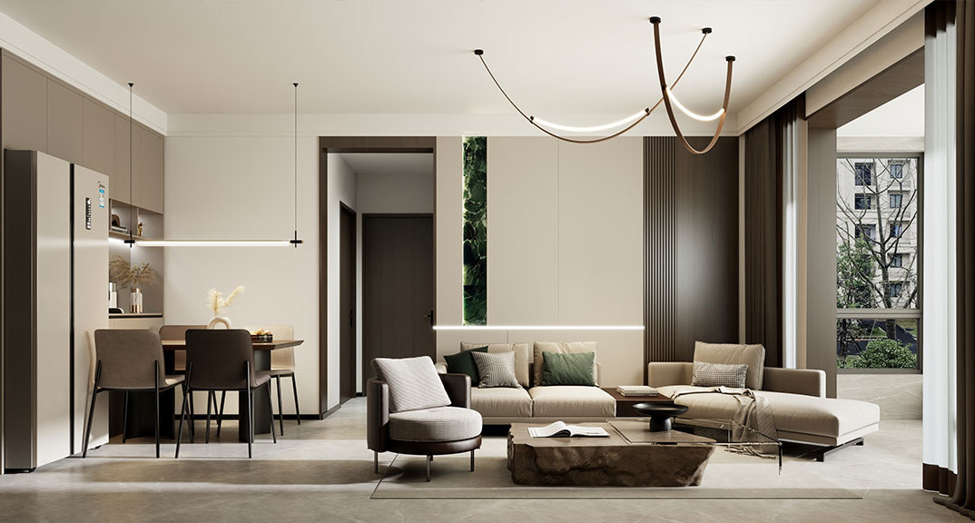 悅動灣109㎡三室兩廳客餐廳現(xiàn)代簡約風格裝修案例效果圖