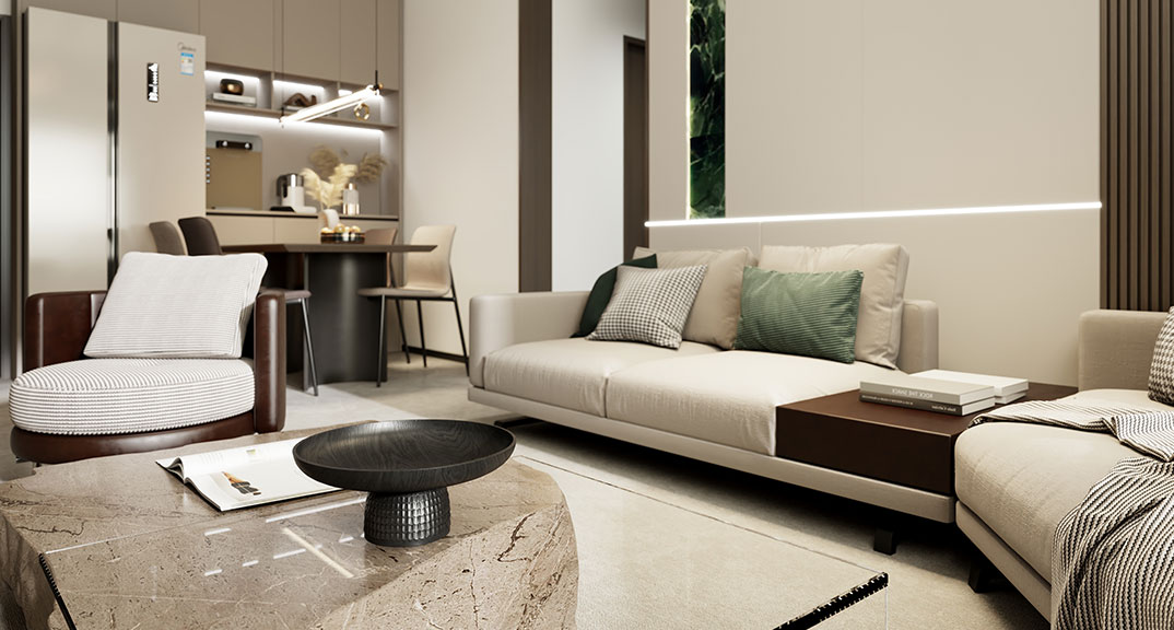 悅動灣109㎡三室兩廳客廳沙發(fā)現(xiàn)代簡約風格裝修案例效果圖
