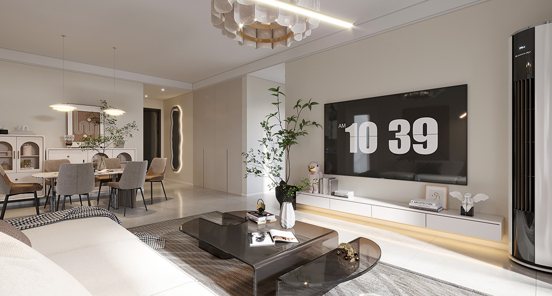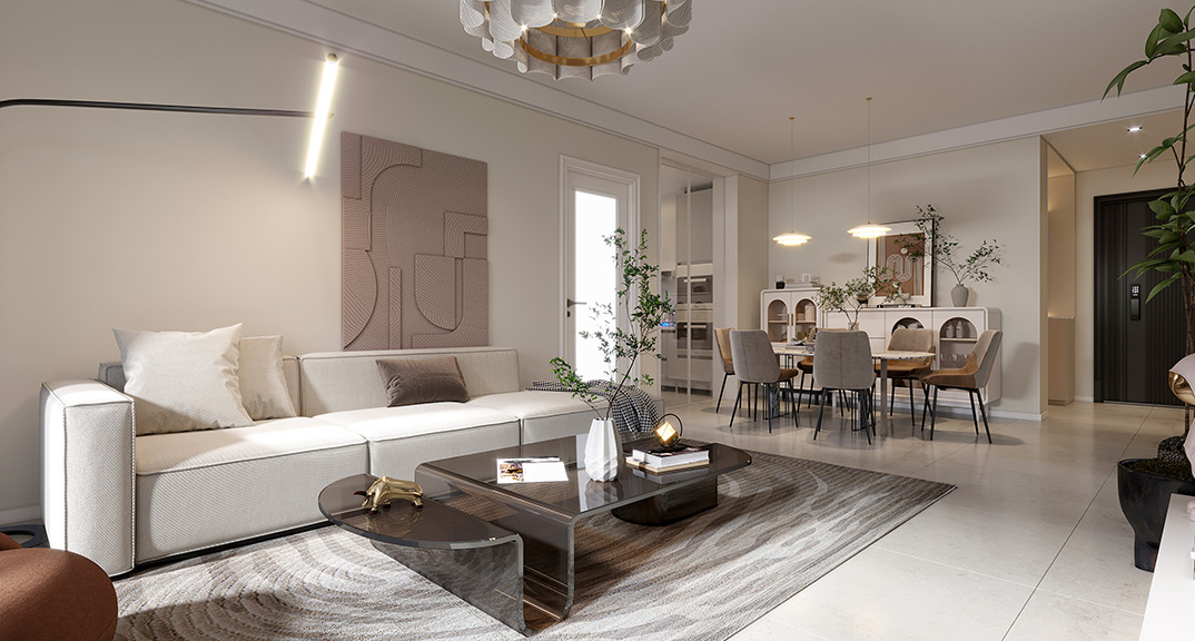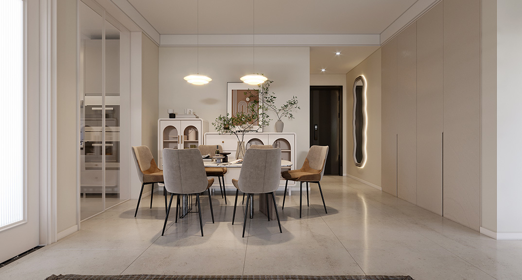 本案的設(shè)計(jì)風(fēng)格為現(xiàn)代,營造簡潔、優(yōu)雅、明亮的氣質(zhì),客廳空間以打造優(yōu)雅品質(zhì)為出發(fā)點(diǎn),聚集多元藝術(shù)空間展現(xiàn)。定制沙發(fā)更能展現(xiàn)空間靈動(dòng)性。餐廳區(qū)域延續(xù)了客廳的色彩搭配,注重美與藝術(shù)呈現(xiàn)方式,大理石桌面、精美的花瓶與酒杯共同烘托熠熠生輝的怡人氣氛,展現(xiàn)溫馨雅致的生活情境。摒棄傳統(tǒng)的餐桌形式,開敞的客廳與餐廳、陽臺(tái)貫通共融,功能與美學(xué)在此結(jié)合,家人情感的交流隨之升華。在材質(zhì)的紋理、區(qū)域的交界、線面的分割、燈光的溫度和家具顏色的變化上,都可見設(shè)計(jì)師的巧妙用心,彰顯優(yōu)雅腔調(diào)與品質(zhì)生活,融合當(dāng)代美學(xué)的居家理念
