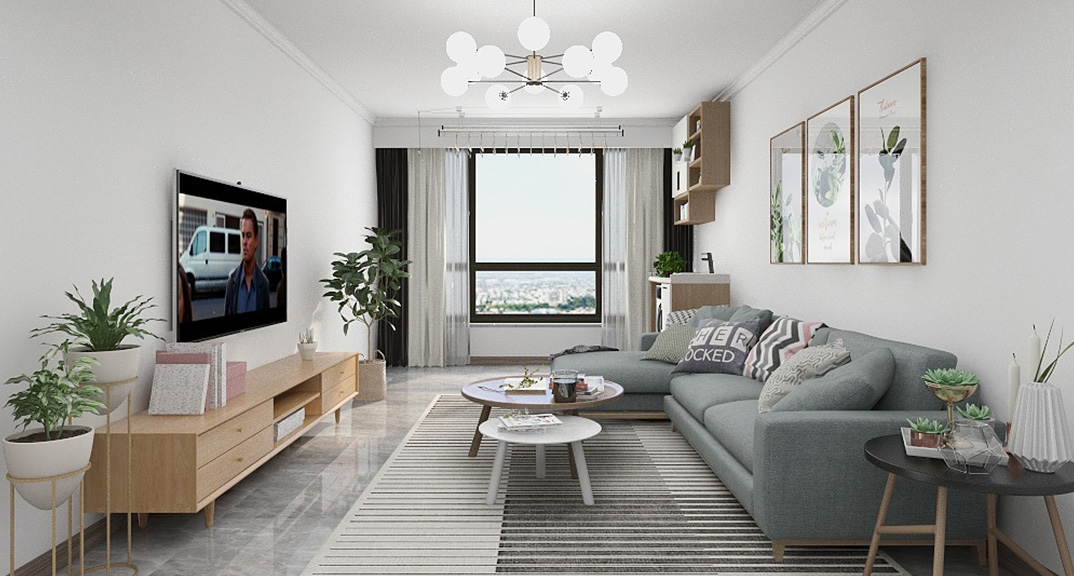 保利時代98㎡三室兩廳客廳原木風戶型研發(fā)效果圖
