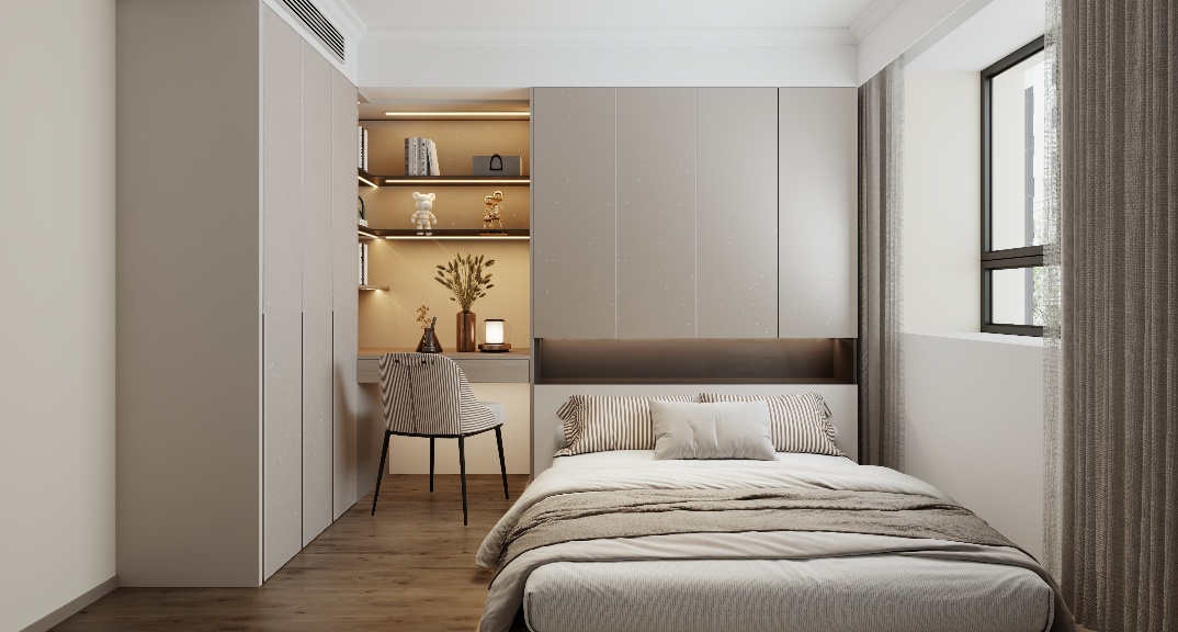 餐廳用六人桌+倒臺(tái)一體既滿足了多人就餐問(wèn)題又能實(shí)現(xiàn)冰吧等品質(zhì)的提升,餐廳簡(jiǎn)潔時(shí)尚,槍灰色色的線性燈吸引著眼球,與金屬餐廳酒柜呼應(yīng),整體色彩搭配和諧而充滿美感??蛷d做滿墻電視柜設(shè)計(jì)既滿足了展示品等小物品的儲(chǔ)藏又不影響觀影效果。主臥室做L型開(kāi)放式衣帽間一點(diǎn)避免衛(wèi)生間門(mén)正對(duì)床的弊端,一點(diǎn)拿去衣服比較方便,臥室進(jìn)門(mén)還能實(shí)現(xiàn)端景美觀又實(shí)用。兒童房用地臺(tái)床結(jié)合床頭衣柜一體化完美體現(xiàn),書(shū)桌結(jié)合玩具柜合理利用空間,活動(dòng)空間也有空余。衛(wèi)生間玻璃隔斷保證了空間的通透明亮,還能防止水分到干區(qū),沐浴區(qū)墻上做壁龕,收納洗浴用品正合適。主衛(wèi)采用了連續(xù)性,相同的空間形成一個(gè)較大的視覺(jué)縱深,層次更豐富,具有更強(qiáng)的流動(dòng)性。