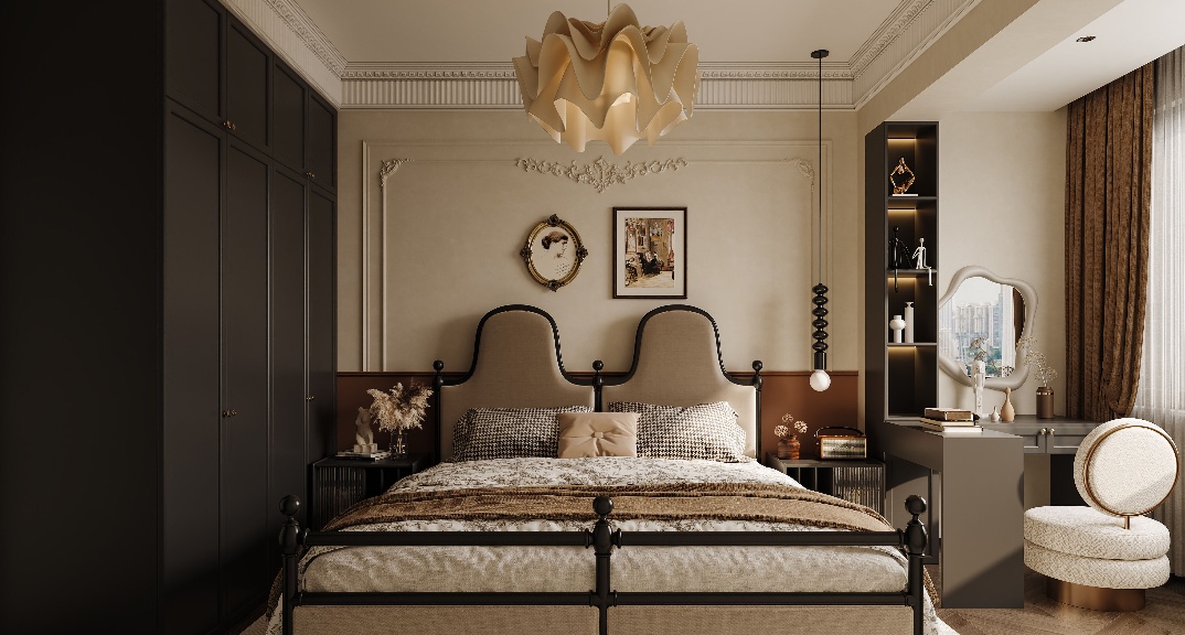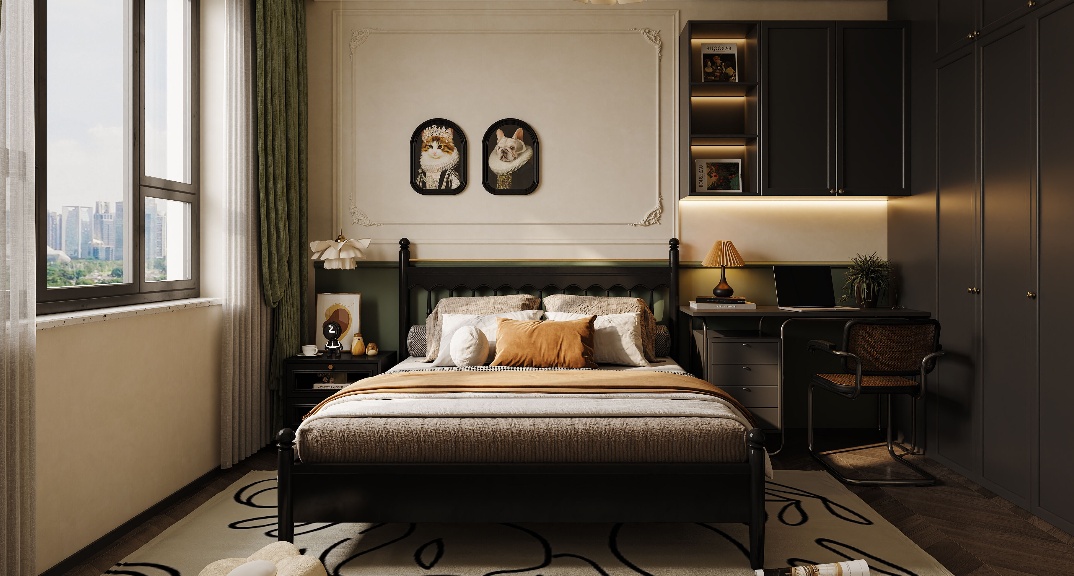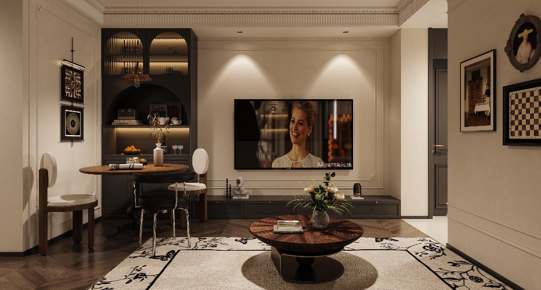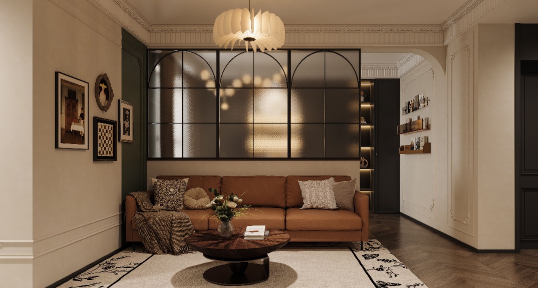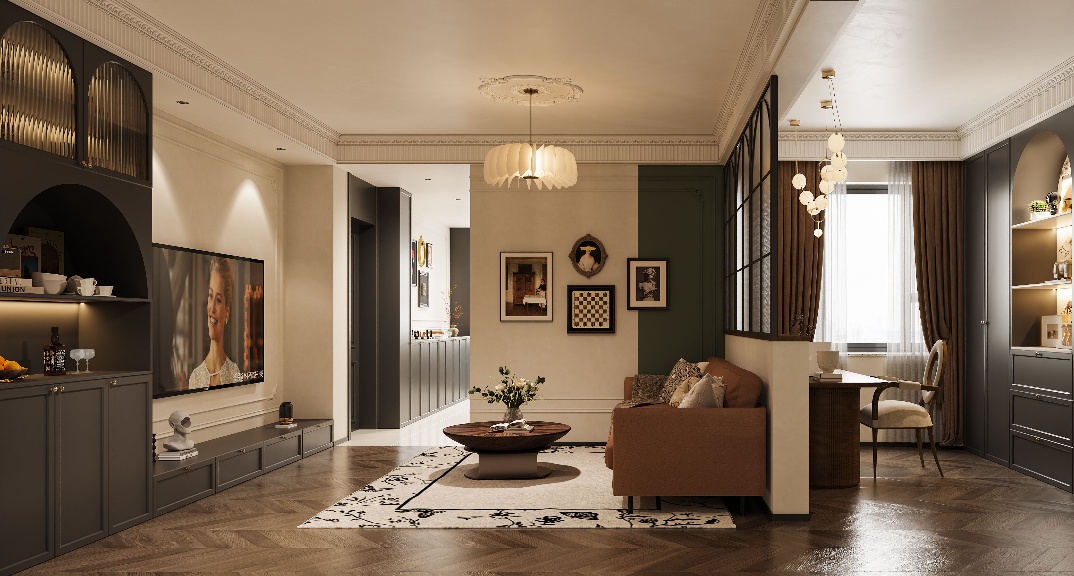 客戶需要書房,考慮到客廳的尺寸,決定在沙發(fā)上后側作為獨立的讀書區(qū),既能中和沙發(fā)和電視之間的距離,也可以增加空間的趣味性,用玻璃間隔做到了隱私性和透光性同時兼顧。