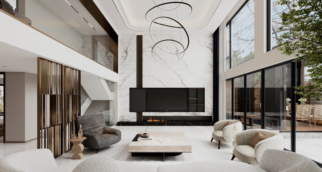 這座五層別墅專(zhuān)為三口之家打造,整體設(shè)計(jì)以現(xiàn)代輕奢風(fēng)格為主。一層為挑空的客廳、餐廳和廚房,營(yíng)造出舒適的社交空間。二、三層為臥室,注重舒適性與私密性,打造溫馨的居住環(huán)境。負(fù)一、二層設(shè)休閑娛樂(lè)區(qū)、空間足夠大的衣帽間,滿(mǎn)足家庭成員的多樣化需求。一層帶有贈(zèng)送庭院,可盡情享受戶(hù)外美景。在材質(zhì)選擇上,運(yùn)用高品質(zhì)的石材、木材和金屬,彰顯質(zhì)感與品味。色彩上,以中性色為基調(diào),搭配局部的亮色點(diǎn)綴,營(yíng)造出時(shí)尚而不失溫馨的氛圍。