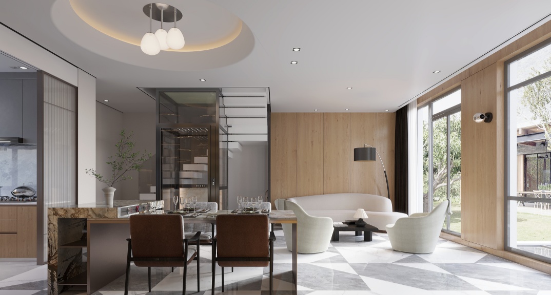 一層為開放式客餐廚空間??蛷d采用無主燈設(shè)計(jì),搭配深色皮質(zhì)沙發(fā)和金屬質(zhì)感茶幾,營造簡約時(shí)尚的氛圍。餐廳與廚房相連,方便日常用餐和家庭聚會(huì)。