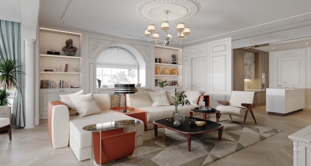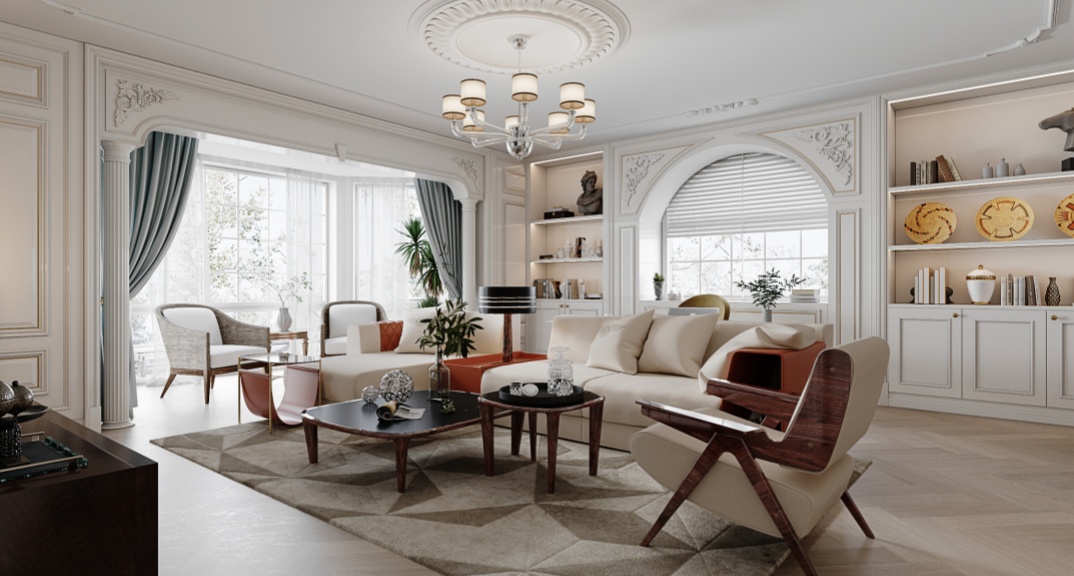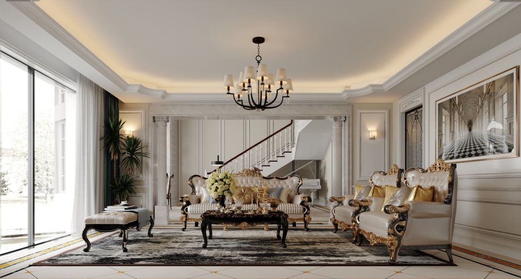 一層以會客和餐飲功能為主。挑空客廳氣勢恢宏,搭配華麗水晶燈和歐式雕花元素,彰顯尊貴氣派。餐廳與廚房相連,方便日常用餐和家庭聚會。